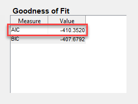 В сводке модели (SARIMA01qx01q12) в таблице Goodness of Fit запишите значение AIC. Например, для переменной модели SARIMA010x010, AIC на этом рисунке.