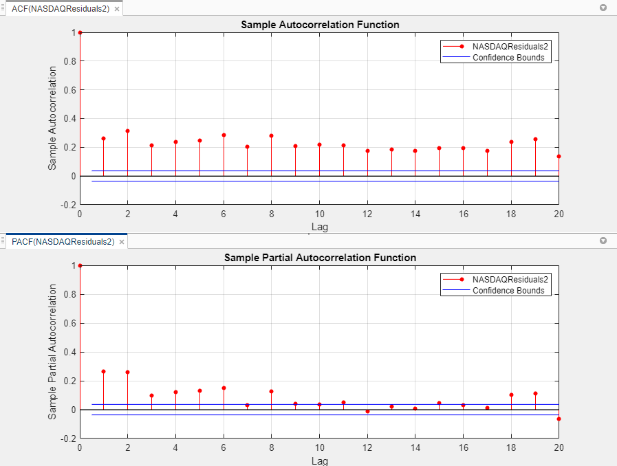 В этом примере показано, как визуально определить, имеет ли ряд значительные эффекты ARCH, путем построения графика автокорреляционной функции (ACF) и частичной автокорреляционной функции (PACF) ряда квадратичных остатков.