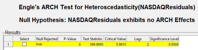Результаты теста отображаются в таблице результатов документа ARCH (NASDAQResiduals).