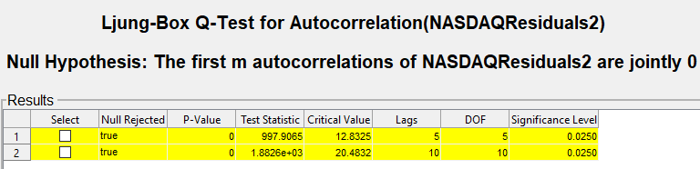 Проверьте нулевую гипотезу о том, что первые m = 5 автокорреляционных запаздываний квадратных остатков совместно равны нулю, используя Q-тест Люнга-Бокса. Затем проверьте нулевую гипотезу, что первые m = 10 автокорреляционных запаздываний возведенных в квадрат остатков совместно равны нулю.