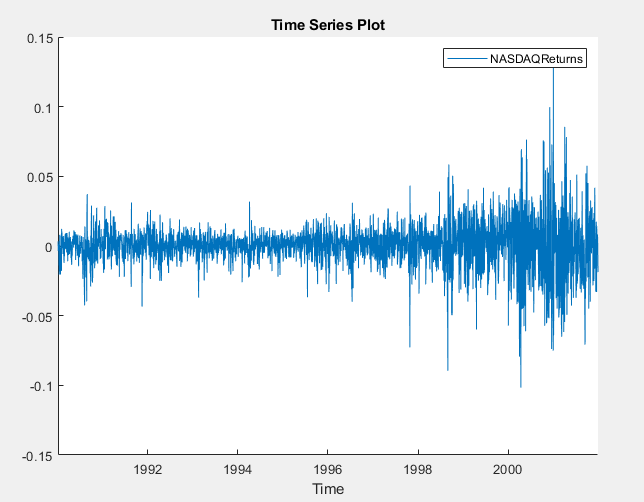 load Data_EquityIdx NASDAQReturns = 100*price2ret(DataTable.NASDAQ); NASDAQReturns = [NaN; NASDAQReturns]; NASDAQResiduals = NASDAQReturns - mean(NASDAQReturns,'omitnan'); DataTable.NASDAQResiduals = NASDAQResiduals; dates = datetime(dates,'ConvertFrom','datenum'); DataTable.Properties.RowNames = {}; DataTable = table2timetable(DataTable,'RowTimes',dates);