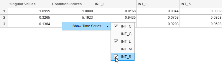 Чтобы выбрать переменную для выполнения статистического теста или создать график, например, щелкните переменную на панели Временной ряд (Time Series). Если вместо этого дважды щелкнуть переменную, приложение также отобразит ее на отдельном графике временных рядов.