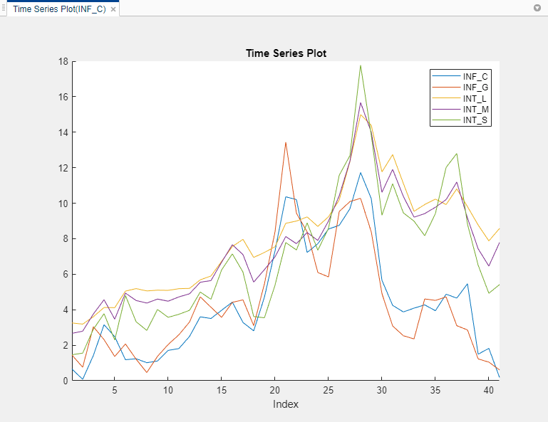 График временных рядов, включающий все переменные, появляется на графике временных рядов (VariableName) фигурное окно, где VariableName - имя одной из переменных на панели «Временной ряд».