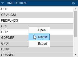 Чтобы открыть, удалить или экспортировать переменную, щелкните ее правой кнопкой мыши на панели «Временной ряд». Затем в контекстном меню выберите нужное действие.