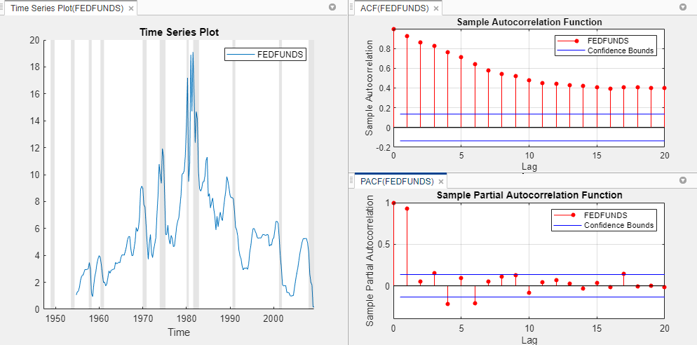 Рассмотрим модель ARIMA для эффективной ставки федеральных фондов (FEDFUNDS). Чтобы определить характеристики модели (например, количество задержек AR или MA), постройте график временных рядов, ACF и PACF.