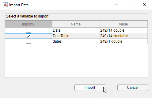 В диалоговом окне «Импорт данных» установите флажок в окне «Импорт»? для переменной, содержащей данные, и нажмите кнопку Импорт. Все переменные в рабочей области поддерживаемого типа данных отображаются в диалоговом окне, но можно выбрать только одну переменную.