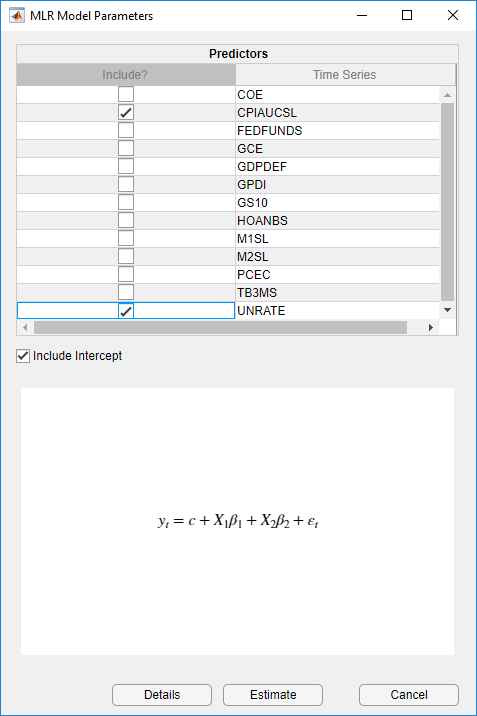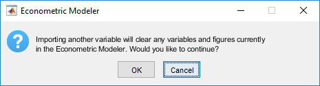 В Econometric Modeler можно импортировать только одну переменную из рабочей области MATLAB. Поэтому перед импортом данных объедините ряд ответов и любой ряд предикторов в одну переменную.