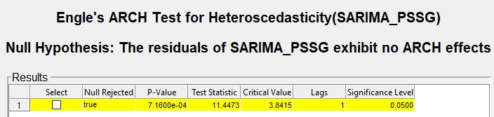 Щелкните Тест ARCH Engle. На вкладке ARCH в разделе Тесты щелкните Выполнить тест, чтобы выполнить тест с параметрами по умолчанию. На правой панели отображается документ ARCH (SARIMA_PSSG), в котором показаны результаты тестирования в таблице Результаты (Results).