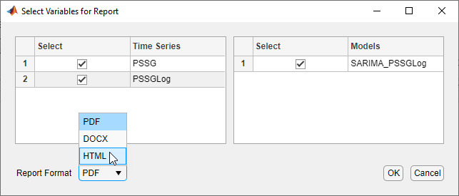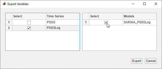 В диалоговом окне «Экспорт переменных» все переменные временных рядов отображаются на левой панели, а все переменные модели - на правой. Выберите временной ряд и переменные модели для экспорта, установив соответствующие флажки в столбце Выбрать (Select). Приложение устанавливает флажок для всех временных рядов или переменных модели, выбранных в областях Временные ряды и модели. Снимите все флажки для переменных, которые не требуется экспортировать. Например, на этом рисунке показано, как выбрать PSSGLog временные ряды и SARIMA_PSSGLog Модель SARIMA.