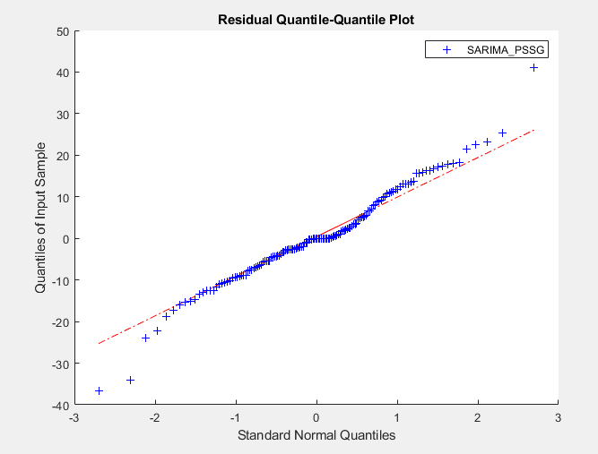 Щелкните Остаточный Q-Q-график (Resident Q-Q Plot). На правой панели отображается окно фигуры с именем QQPlot (SARIMA_PSSG), содержащее квантильный график остатков.