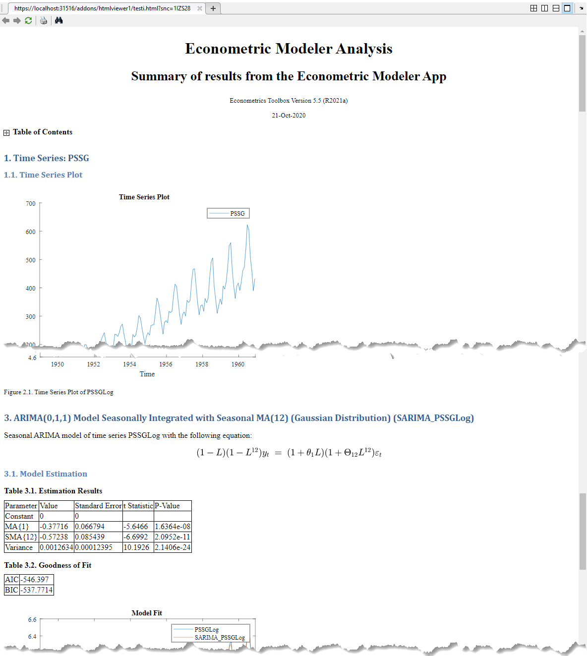 Econometric Modeler может создать отчет, описывающий действия с выбранными временными рядами и переменными модели. Приложение упорядочивает отчет по главам, соответствующим выбранным временным рядам и переменным модели. В главах описываются сеансовые операции, выполняемые с соответствующей переменной.