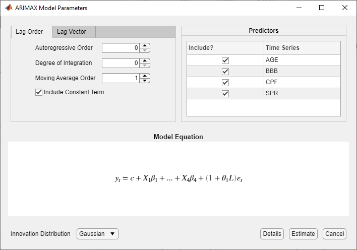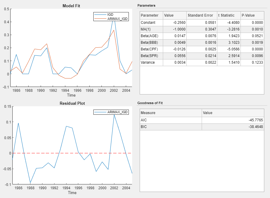 В этом примере показано, как задать и оценить модель ARIMAX с помощью приложения Econometric Modeler. Набор данных, который хранится в Data_CreditDefaults.mat, содержит годовые ставки дефолта корпоративных облигаций инвестиционного уровня, среди прочих предикторов, с 1984 по 2004 год. Рассмотрим моделирование ставок корпоративных облигаций по умолчанию как линейную динамическую функцию других временных рядов в наборе данных.