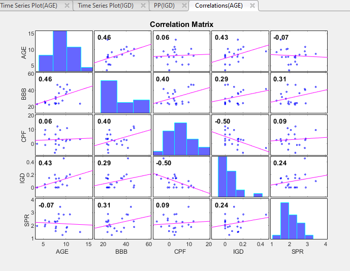 Все предикторы, по-видимому, слабо связаны с IGD. Можно проверить, являются ли коэффициенты корреляции значимыми, используя corrplot в командной строке.