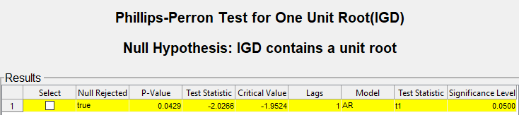Оценить, IGD имеет единичный корень, проводя тест Филлипса-Перрона: