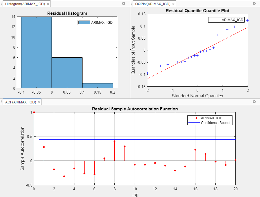 На правой панели перетащите окна рисунка Гистограмма (ARIMAX_IGD) и QQPlot (ARIMAX_IGD) так, чтобы они занимали два верхних квадранта, и перетащите ACF так, чтобы он занимал два нижних квадранта.