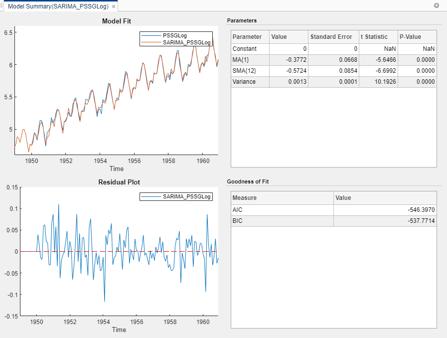 Переменная модели SARIMA_PSSGLog появляется на панели Модели (Models), его значение появляется на панели Предварительный просмотр (Preview), а его оценочная сводка появляется в документе Сводка модели (Model Summary (SARIMA_PSSGLog)).