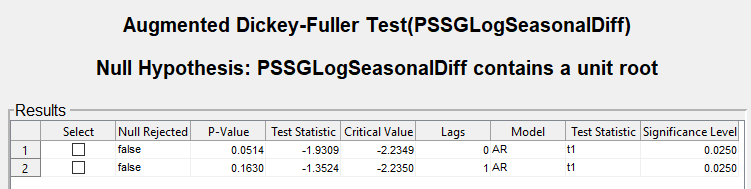 Проверьте нулевую гипотезу, что PSSGLogSeasonalDiff имеет корень единицы измерения с помощью теста Augmented Dickey-Fuller. Укажите, что альтернативой является модель AR (0), а затем снова проверьте, задав модель AR (1). Скорректируйте уровень значимости до 0,025, чтобы сохранить общий уровень значимости 0,05.