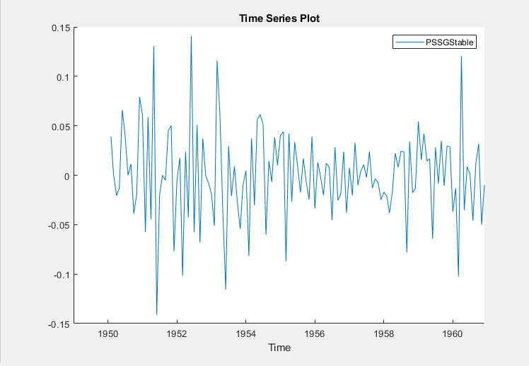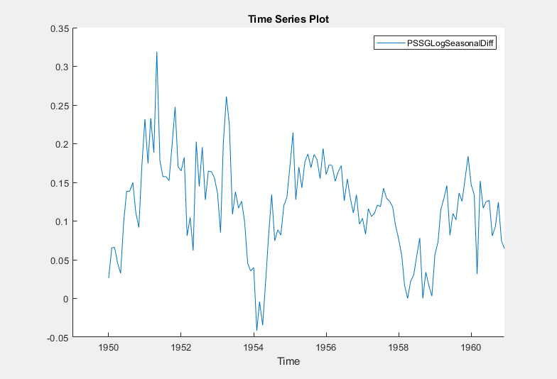 Преобразованная переменная PSSGLogSeasonalDiff появляется на панели Временной ряд (Time Series), а его график временных рядов появляется в окне рисунка Временной ряд (PSSGLogSeasonedDiff).