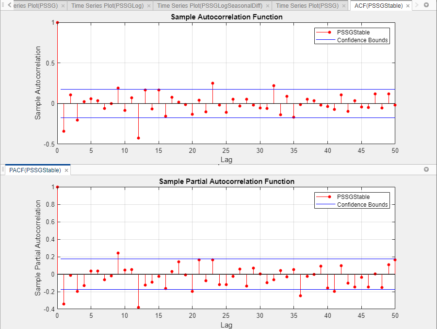 Перетащите окно фигуры ACF (PSSGStable) над окном фигуры PACF (PSSGStable).