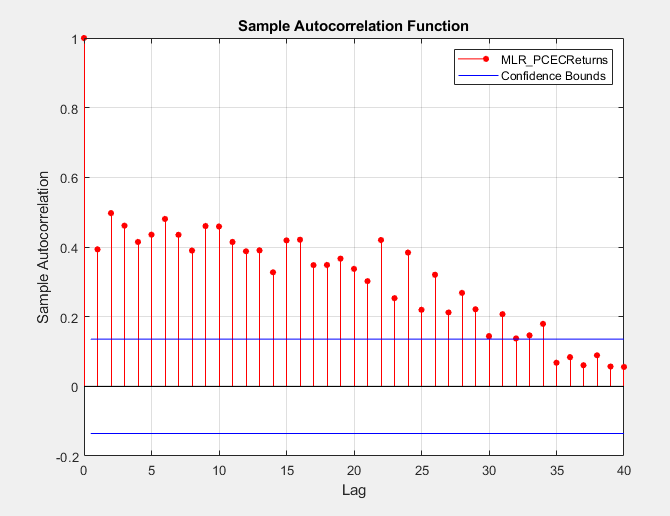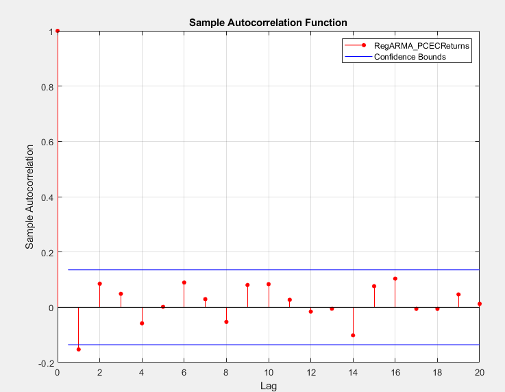 На вкладке Econometric Modeler в разделе Диагностика выберите Остаточная диагностика > Функция автокорреляции.