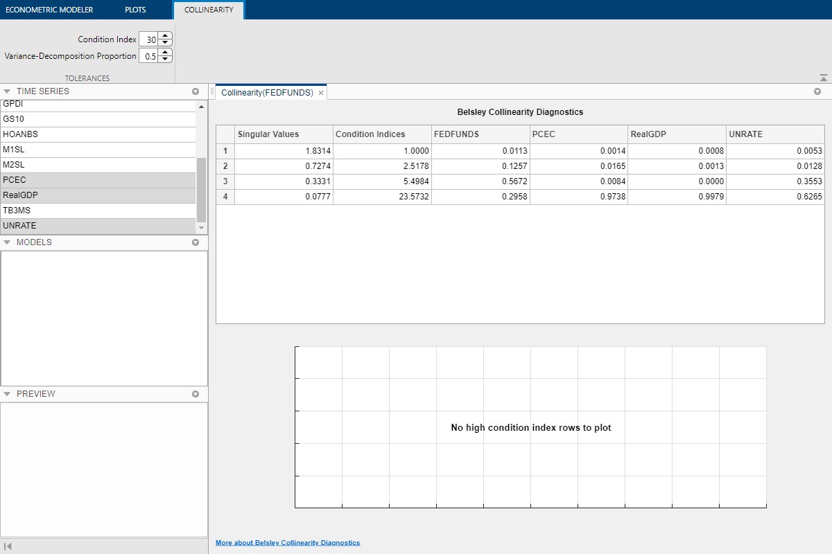 На вкладке Econometric Modeler в разделе Tests (Тесты) выберите New Test (Новый тест) > Belsley Collinearity Diagnostics (Диагностика коллинеарности).