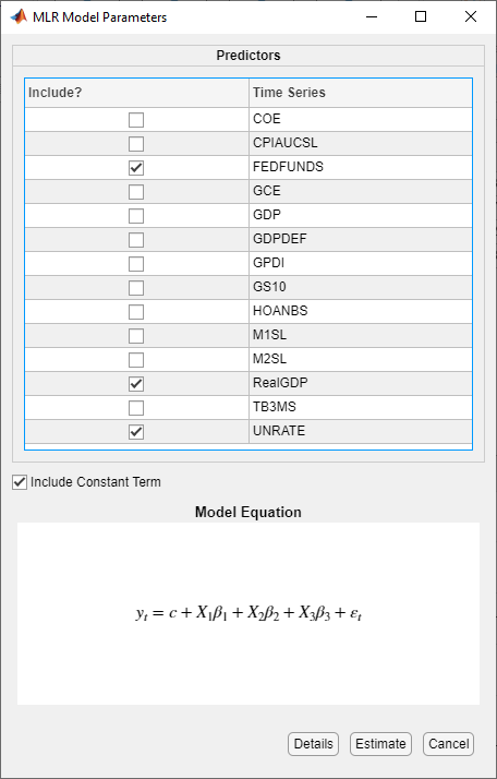 В диалоговом окне Параметры модели MLR (MLR Model Parameters) в разделе Предикторы (Predictors) выберите параметр Включить (Include)? флажок для FEDFUNDS, RealGDP, и UNRATE временные ряды.