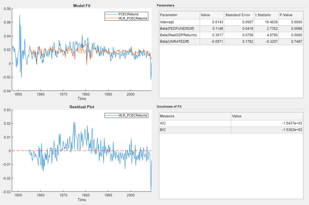 Переменная модели MLR_PCECReturns появляется на панели Модели (Models), его значение появляется на панели Предварительный просмотр (Preview), а его оценочная сводка появляется в документе Сводка модели (Model Summary (MLR_PCECReturns)).