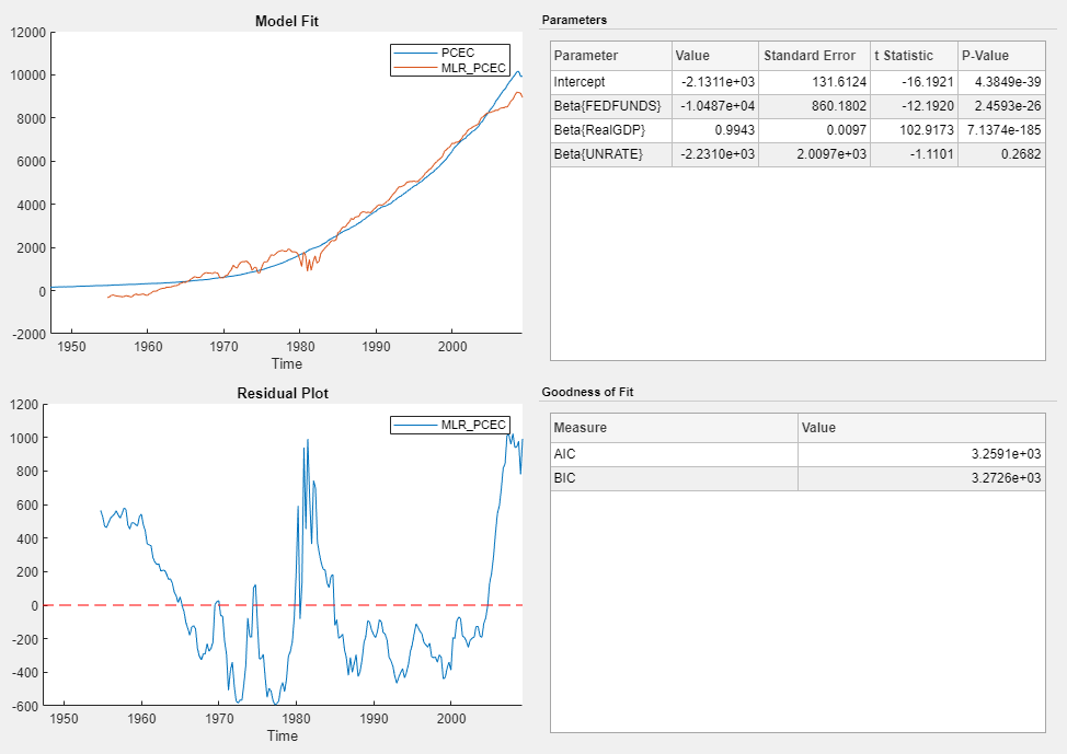 В этом примере показано, как задать и оценить регрессионную модель с ошибками ARMA с помощью приложения Econometric Modeler. Набор данных, который хранится в Data_USEconModel.mat, содержит расходы на личное потребление в США, измеряемые ежеквартально, среди прочих серий.