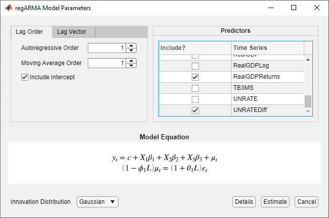 В диалоговом окне Параметры модели MLR (MLR Model Parameters) в разделе Предикторы (Predictors) выберите параметр Включить (Include)? флажок для FEDFUNDSDiff, RealGDPReturns, и UNRATEDiff временные ряды.