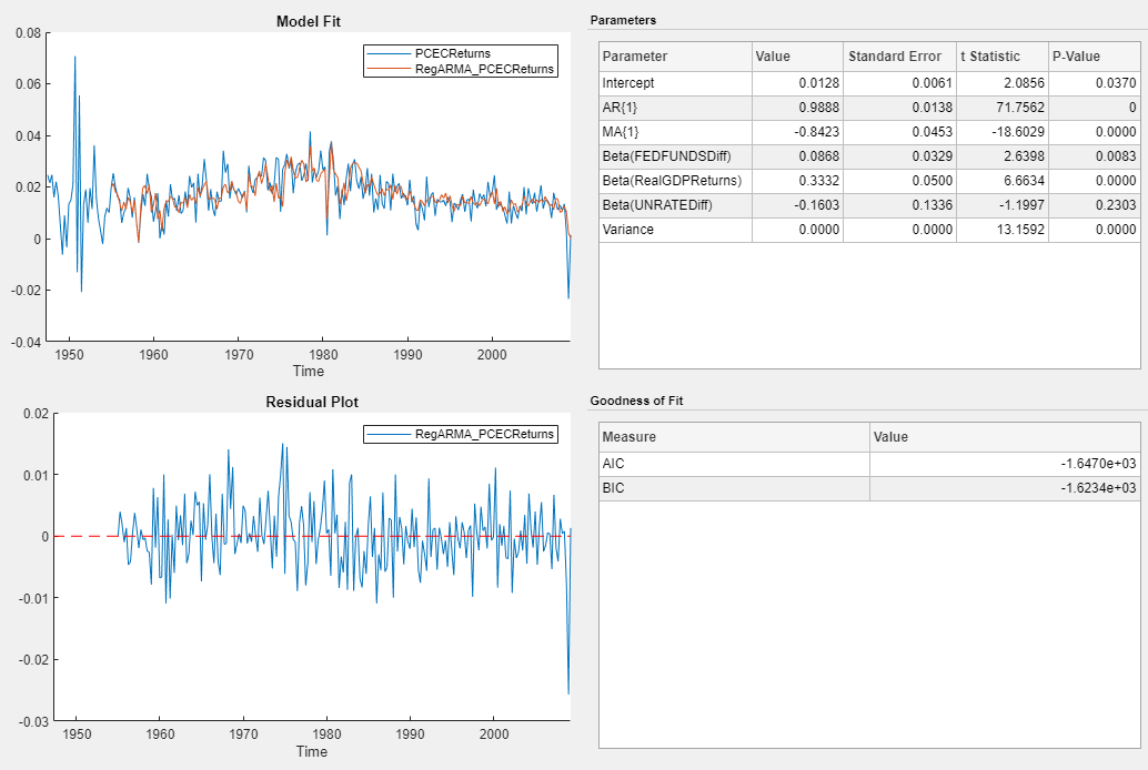 Переменная модели RegARMA_PCECReturns появляется на панели Модели (Models), его значение появляется на панели Предварительный просмотр (Preview), а его оценочная сводка появляется в документе Сводка модели (Model Summary (RegARMA_PCECReturns)).