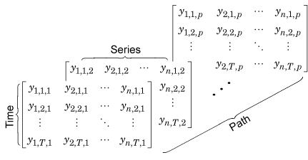 Y( = yj, t, что является наблюдением t переменной ответа j. Единый путь данных, созданных из переменных предиктора или других переменных, имеет аналогичную форму.t,j)