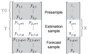 estimate синхронизируется X и Y относительно последнего наблюдения в массивах (T - K на предыдущем рисунке) и применяет только необходимое количество наблюдений к регрессионной составляющей. Это действие подразумевает, что X может иметь больше строк, Y.