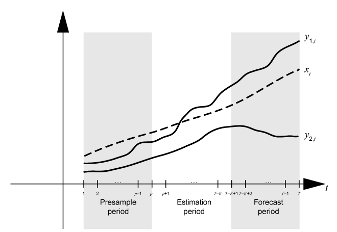 Период предварительного отбора - содержит данные, используемые для инициализации запаздывающих значений в модели. Как модели VAR (p), так и модели VEC (p-1) требуют периода предварительной выборки, содержащего по меньшей мере p многомерных наблюдений. Например, если планируется подогнать модель VAR (4), условное ожидаемое значение yt, учитывая его историю, содержит yt - 1, yt - 2, yt - 3 и yt - 4. Условное ожидаемое значение y5 является функцией y1, y2, y3 и y4. Следовательно, вклад правдоподобия y5 требует y1-y4, что подразумевает, что данные не существуют для вклада правдоподобия y1-y4. В этом случае оценка модели требует периода предварительной выборки, по меньшей мере, из четырех временных точек.