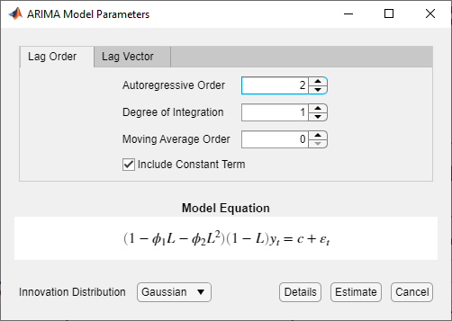 На вкладке Эконометрический моделирующий (Econometric Modeler) в разделе Модели (Models) щелкните АРИМА (ARIMA).