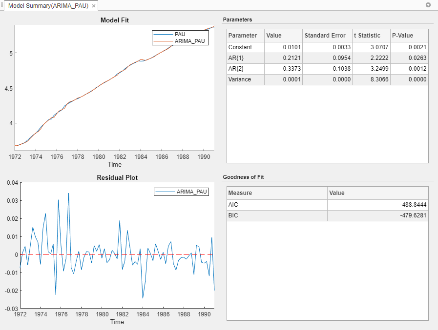 Оценка модели ARIMA (2,1,0) для ежеквартального австралийского ИПЦ в журнале (подробности см. в разделе Реализация выбора и оценки модели Бокса-Дженкинса с использованием приложения эконометрического моделирования).
