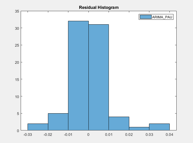 С ARIMA_PAU выбрано на панели Модели (Models), на вкладке Эконометрический моделер (Econometric Modeler) в разделе Диагностика (Diagnostics) щелкните Остаточная диагностика (Resident Diagnostics) > Остаточная гистограмма (Resid