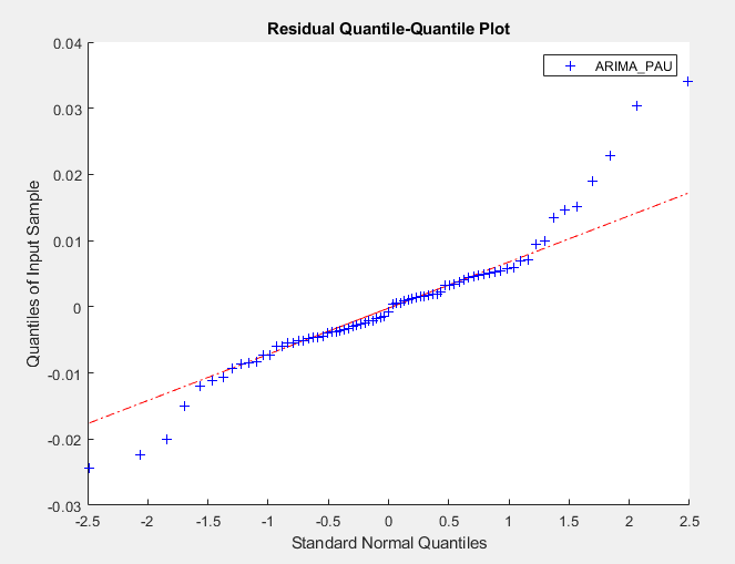 Проверьте график квантиль-квантиль, щелкнув окно рисунка QQPlot (ARIMA_PAU).