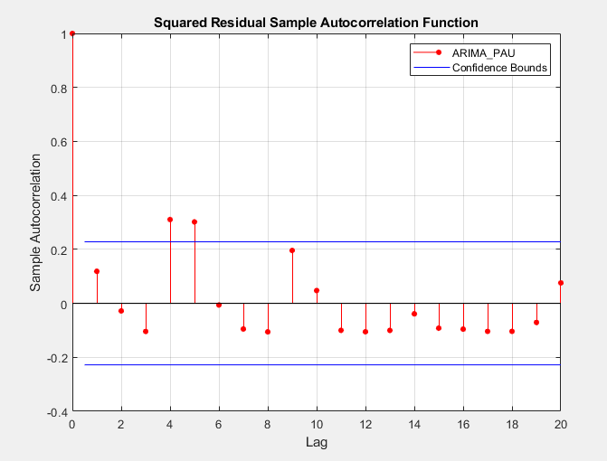 Визуально оценить, проявляют ли остатки гетероскедастичность, путем построения графика ACF квадратичных остатков. С ARIMA_PAU на панели Модели (Models) щелкните вкладку Эконометрический моделер (Econometric Modeler). Затем щелкните раздел Диагностика (Diagnostics), щелкните Остаточная диагностика (Resident Diagnostics) > Сдвоенная остаточная автокорреляция (Squared Resident Autoc