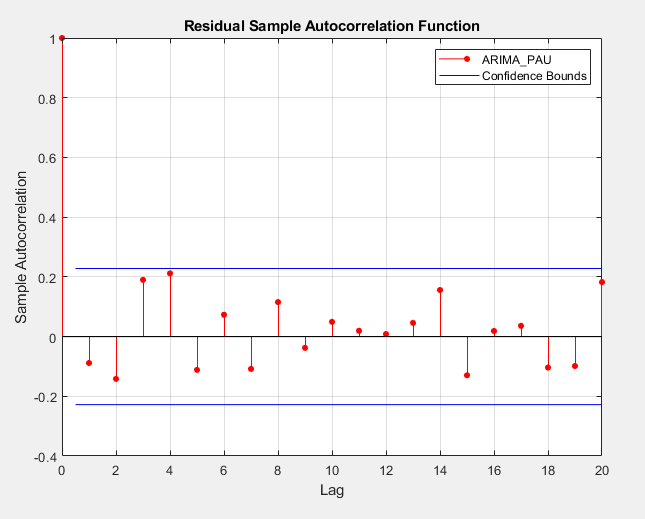 Визуально оцените последовательную корреляцию остатков путем построения их автокорреляций. С ARIMA_PAU на панели Модели (Models) в разделе Диагностика (Diagnostics) щелкните Остаточная диагностика (Resident Diagnostics) > Функция автокорреляции (Autocorration Function