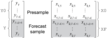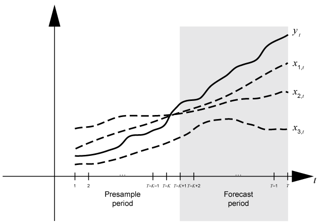 Обычной практикой является подгонка динамической модели к части набора данных, а затем проверка предсказуемости модели путем сравнения ее прогнозов с наблюдаемыми ответами. Во время прогнозирования период предварительной выборки содержит данные, которым соответствует модель, а период прогноза содержит выборку с удержанием для проверки. Предположим, что yt является наблюдаемым рядом ответов; x1, t, x2, t и x3, t наблюдаются экзогенные ряды; и время t = 1,...,T. Рассмотреть возможность прогнозирования ответов из динамической модели yt, содержащей компонент регрессииnumperiods = K периодов. Предположим, что динамическая модель соответствует данным в интервале [1,T - K] (дополнительные сведения см. в разделе estimate). На этом рисунке показаны разделы временной базы для прогнозирования.