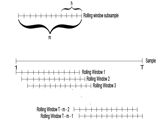 Предположим, что число приращений между последовательными окнами качения равно 1 периоду, затем разбейте весь набор данных на N = T-m + 1 подпробов. Первое скользящее окно содержит наблюдения за период с 1 по m, второе скользящее окно содержит наблюдения за период с 2 по m + 1 и так далее.
