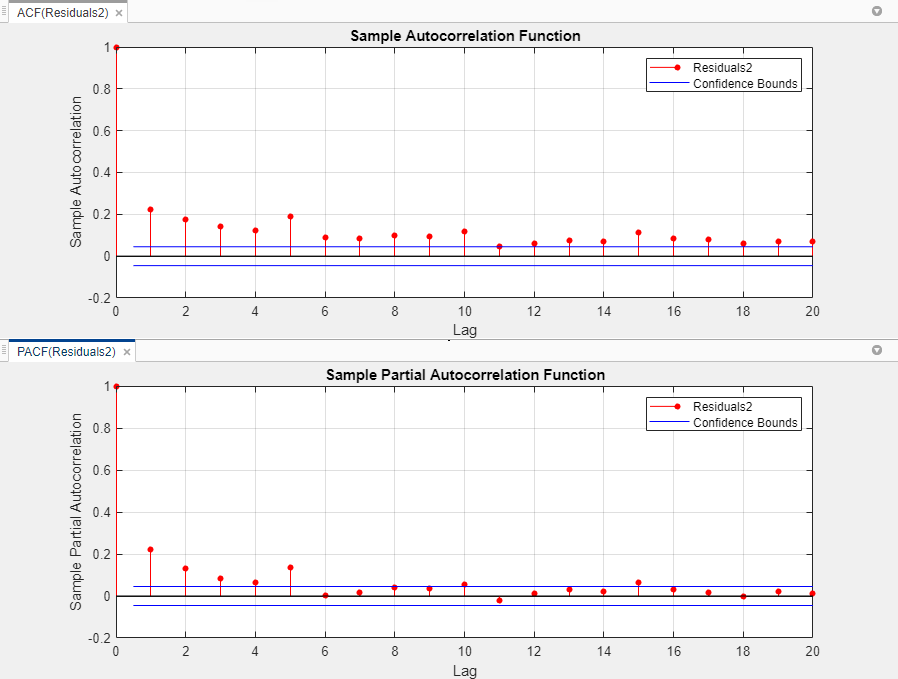 Перетащите окно фигуры PACF (Residuals2) под окно фигуры ACF (Residuals2), чтобы их можно было просматривать одновременно.