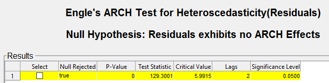 Тест ARCH Энгла отвергает нулевую гипотезу об отсутствии эффектов ARCH в пользу альтернативной модели ARCH с двумя отставшими в квадрате инновациями. Модель ARCH с двумя запаздывающими инновациями локально эквивалентна модели GARCH (1,1).