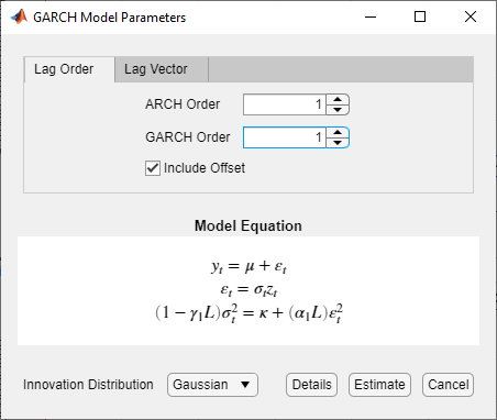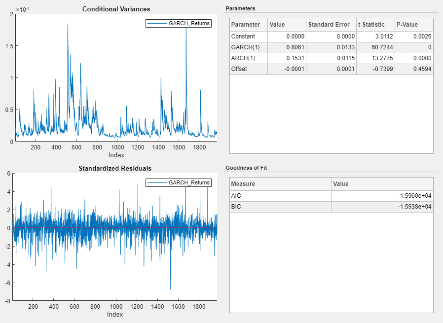 Альтернативным способом выбора лагов для модели GARCH является подгонка нескольких моделей, содержащих различные степени полинома запаздывания. Затем выберите модель, обеспечивающую минимальный AIC.