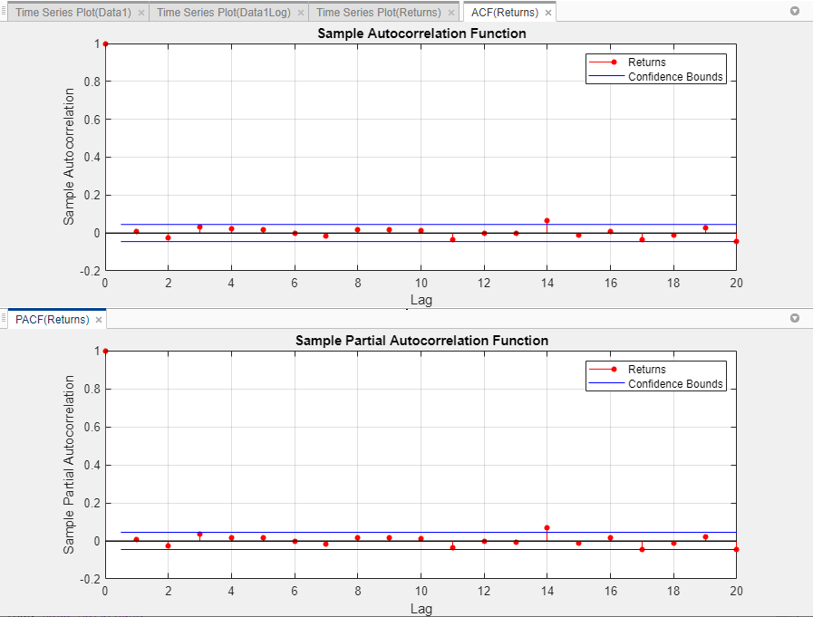 Перетащите окно фигур PACF (Returns) под окно фигур ACF (Returns), чтобы их можно было просматривать одновременно.