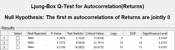 Нулевая гипотеза Q-теста Ljung-Box о том, что все автокорреляции вплоть до тестируемых лагов равны нулю, не отклоняется для тестов на лагах 5, 10 и 15. Эти результаты и ACF и PACF предполагают, что условная средняя модель не нужна для этого ряда возвращений.