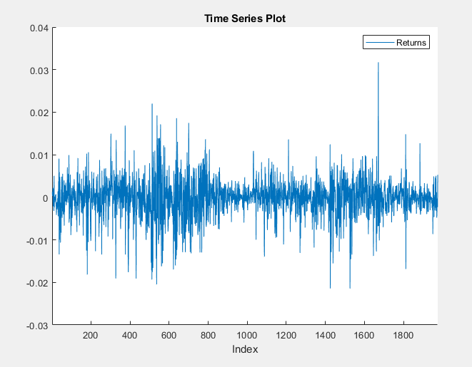 Серия возвратов колеблется вокруг общего уровня, но демонстрирует кластеризацию волатильности. Большие изменения в возвращаемых данных имеют тенденцию объединяться, а небольшие изменения имеют тенденцию объединяться. То есть серия проявляет условную гетероскедастичность.