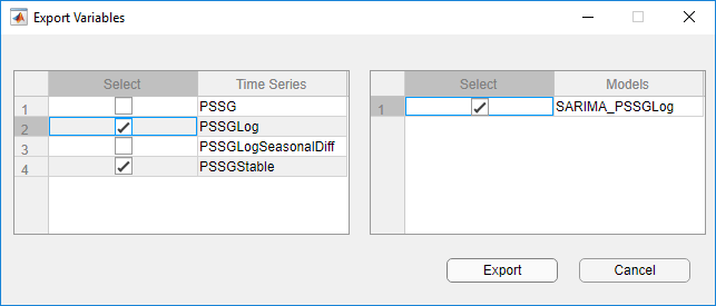 В диалоговом окне «Экспорт переменных» установите флажки «Выбрать» для PSSGLog и PSSGStable временные ряды и SARIMA_PSSGLog модель (при необходимости). Приложение автоматически устанавливает флажки для всех переменных, подсвеченных в областях Временные ряды и Модели.