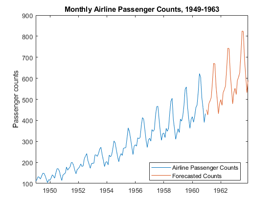 fh = DataTable.Time(end) + calmonths(1:numObs); figure; plot(DataTable.Time,exp(PSSGLog)); hold on plot(fh,exp(fPSSG)); legend('Airline Passenger Counts','Forecasted Counts',... 'Location','best') title('Monthly Airline Passenger Counts, 1949-1963') ylabel('Passenger counts') hold off