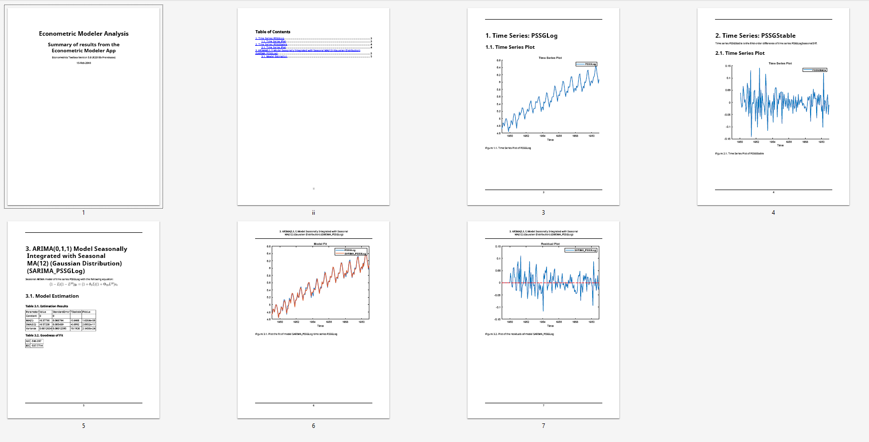 Приложение публикует код, необходимый для создания PSSGLog, PSSGStable, и SARIMA_PSSGLog в PDF C:\MyData\SARIMAReport.pdf. Отчет включает в себя: